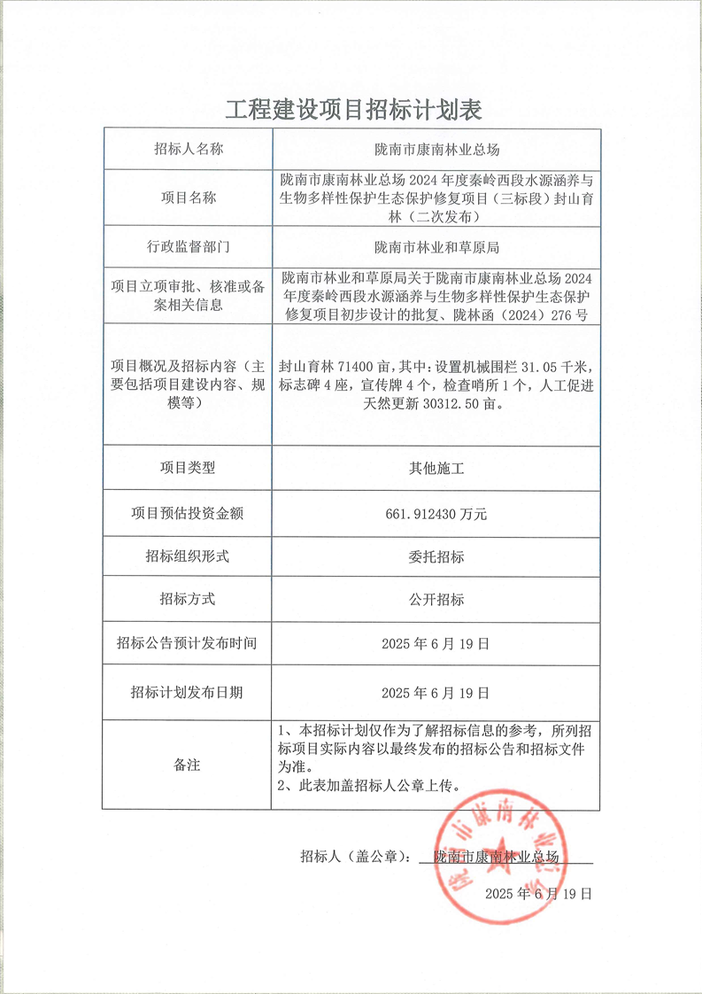 隴南市康南林業(yè)總場2024年度秦嶺西段水源涵養(yǎng)與生物多樣性保護生態(tài)保護修復(fù)項目(三標段)封山育林(二次發(fā)布)