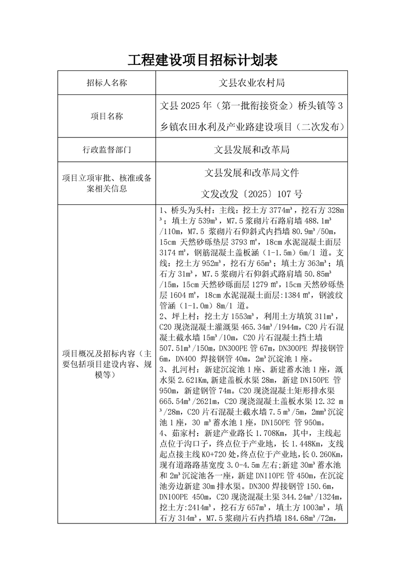 文縣2025年(第一批銜接資金)橋頭鎮(zhèn)等3鄉(xiāng)鎮(zhèn)農(nóng)田水利及產(chǎn)業(yè)路建設(shè)項(xiàng)目(二次發(fā)布)