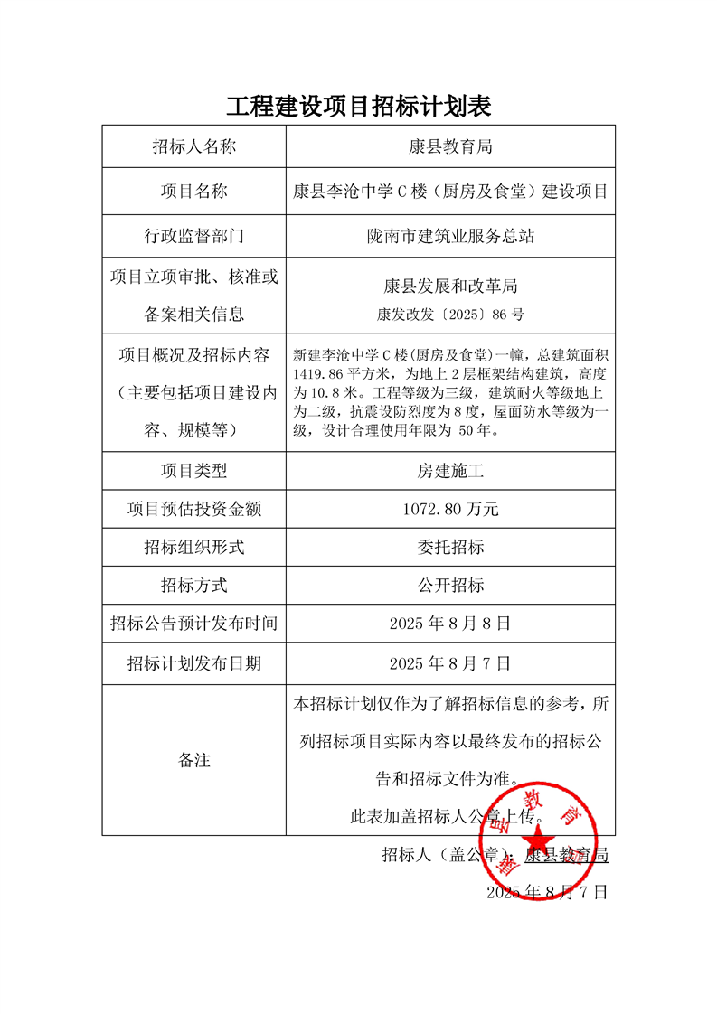 康縣李滄中學C樓(廚房及食堂)建設項目