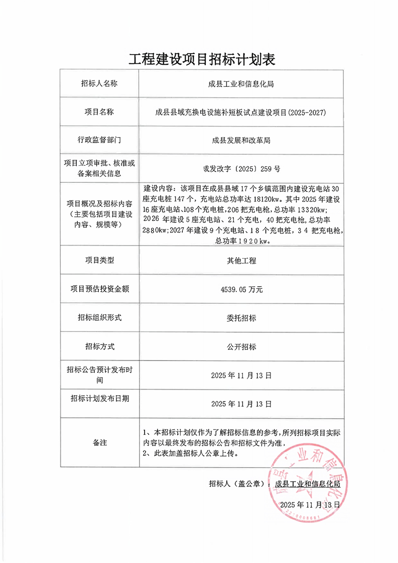 成縣縣域充換電設(shè)施補短板試點建設(shè)項目(2025-2027)