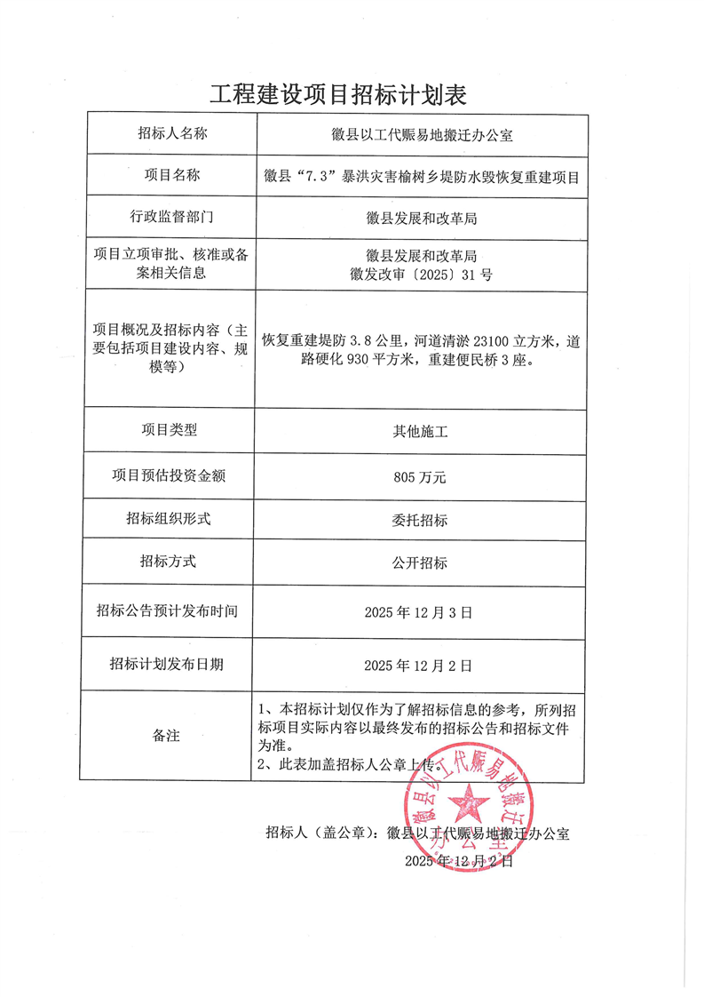 徽縣“7.3”暴洪災(zāi)害榆樹鄉(xiāng)堤防水毀恢復重建項目