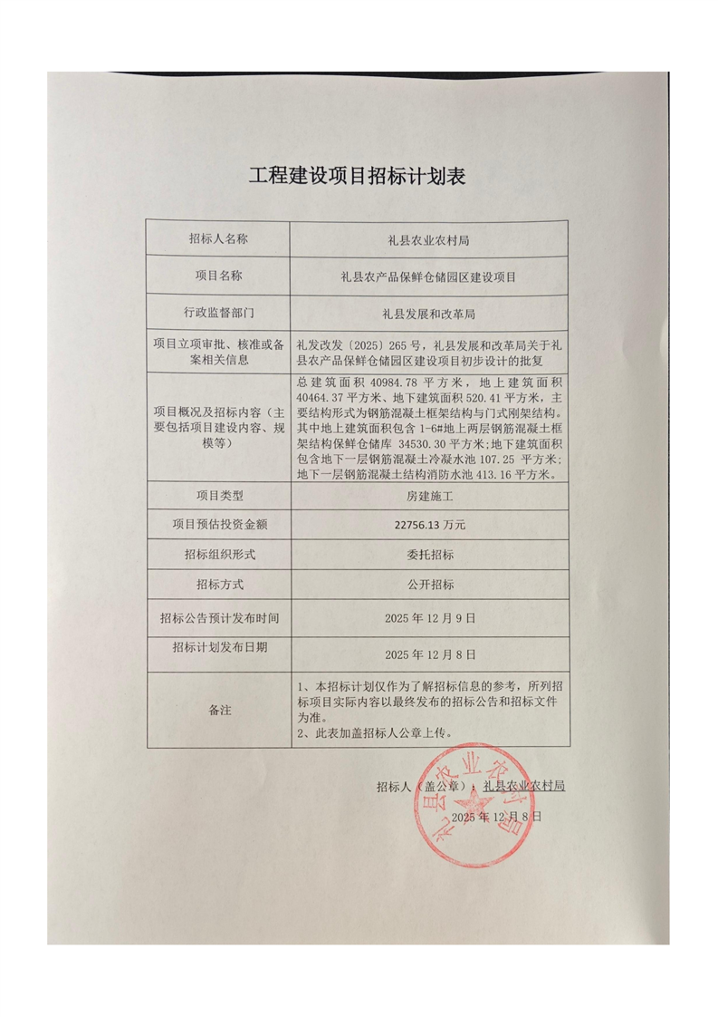 禮縣農(nóng)產(chǎn)品保鮮倉(cāng)儲(chǔ)園區(qū)建設(shè)項(xiàng)目